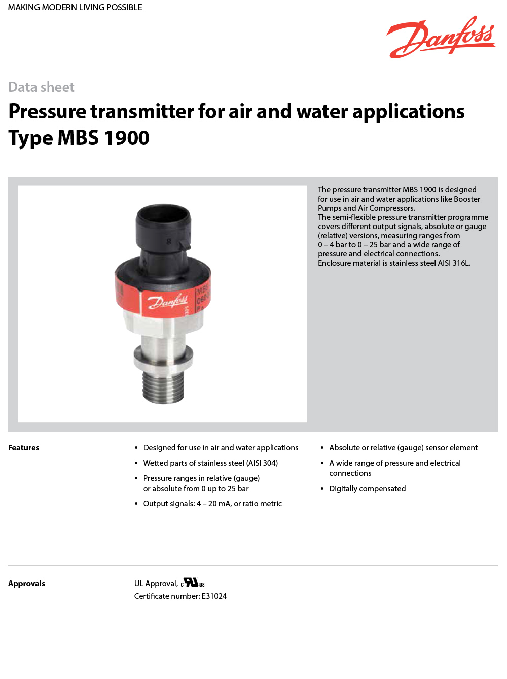 mbs 1900, 空气与水应用的压力变送器