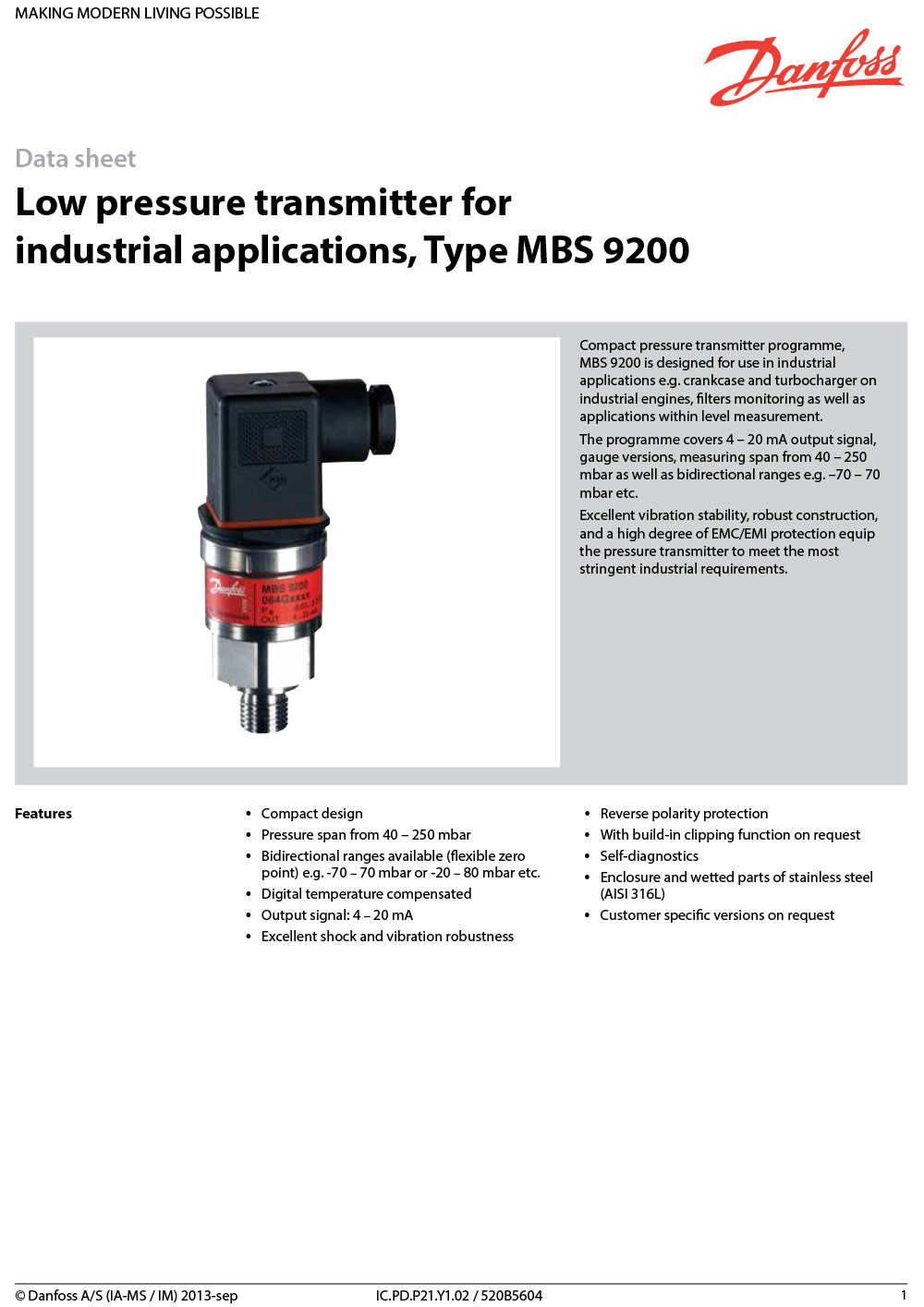 mbs 9200, 紧凑型压力变送器