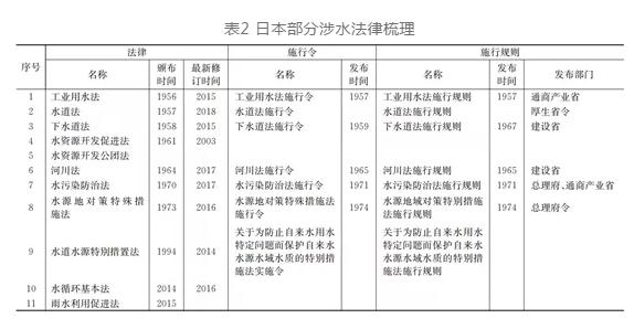 日本的法律体系可以分为宪法、法律、政令、省令和通达5个层次。通过国会颁布法律、内阁颁布政令以及省颁布省令,对涉水工作进行全面的规定(见表2)。例如国会颁布《河川法》,内阁负责发布《河川法施行令》,主管河道的国土交通省负责发布《河川法施行规则》。整个法律体系层次清晰、责任明确、详略互补,全方位指导涉水工作的开展。日本城市水系统相关法律较为丰富,核心的涉水法律有《河川法》《水资源开发促进法》《水道法》《下水道法》《水污染防治法》等10余部,覆盖了河流水系、水资源、供水、用水、排水、水环境和健康水循环理念等水系统多角度、全要素的内容。日本涉水法律内容详尽,明确涉水工作的责任主体、职能分工、协调机制,部分法律还对技术标准进行详细规定,例如《水道法》将水质基准的内容纳入法律框架体系,强化了标准执行力度。日本涉水法律体系修订更新周期短,如有必要最短1年时间即可开展法律修订,例如《下水道法》在2005年、2011年和2015年分别针对城市内涝、事权改革、雨水公共下水道建设问题开展修订,极大的保障了法律的适应性。