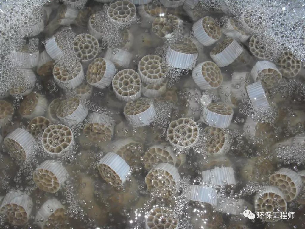 载体在水中的碰撞和剪切作用,使空气气泡更加细小,增加了氧气的利用率。另外,每个载体内外均具有不同的生物种类,内部生长一些厌氧菌或兼氧菌,外部为好氧菌,这样每个载体都为一个微型反应器,使硝化反应和反硝化反应同时存在,从而提高了处理效果。