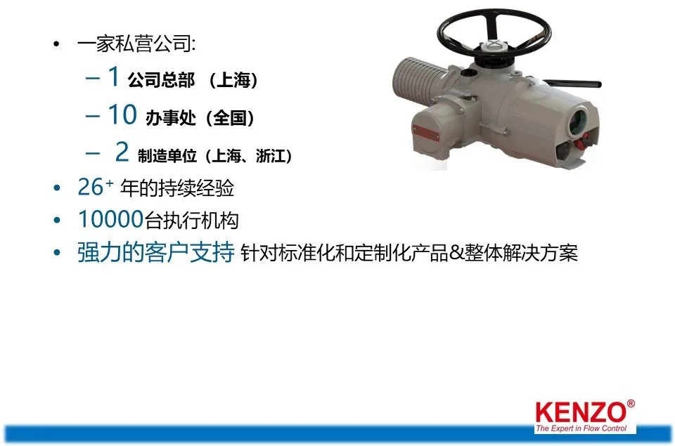 肯佐控制设备(上海)有限公司总部位于上海市青浦区练塘工业园区。公司拥有2个制造工厂,占地70余亩;主要生产智能型电动执行机构及齿轮箱,是一家致力于电动执行机构研发、生产、销售和服务的专业公司。