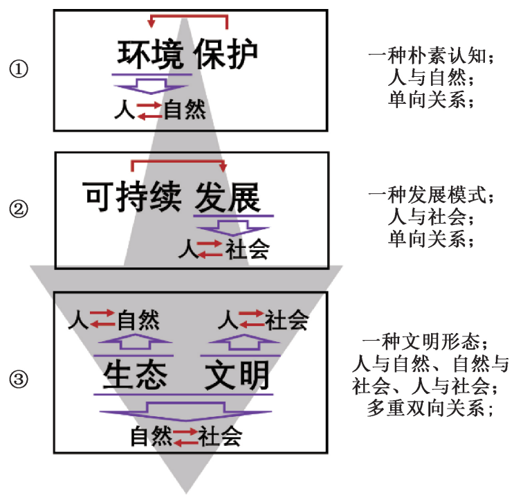 “生态文明”的概念,描述的则是一种历史上未曾出现过的文明形态。它提出以“人与自然、自然与社会、人与社会和谐共生、良性循环、全面发展、持续繁荣”为基本宗旨的社会形态。它的内涵包括而又超越之前的认识,“生态”两字反映着人与自然的关系,保护自然同时享用自然;“文明”两字反映着人与自然、社会之间的关系,人类要敬畏自然,个人服从社会,同时社会支撑个人的发展;“生态”与“文明”衔接,反映着自然与社会之间的关系,自然以资源的方式为社会提供物质基础,社会以科技的方式尊重自然。“生态文明”概念,蕴含多重双向关系,超越了狭义的“环境保护”以及“可持续发展”,在关注“人与自然”关系的传统观念基础上,增加了对“自然与社会”和“人与社会”之间和谐关系的强调,是对环境保护概念的一次创造性升级深化,为人类文明的走向提供了一种超越“工业文明”的新形态,即,这是一种“生态”的“文明”,这种“文明”以文明的方式对待“生态”。