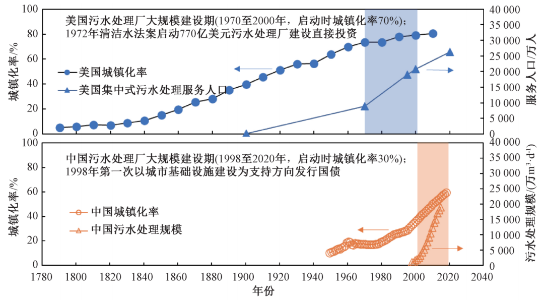快速城镇化导致的污水处理厂与周边社区之间的矛盾关系,是我国污水处理行业面临的特色问题,与我国快速城镇化的历史背景相关。从2000年到2020年,我国只用了20年的时间完成了城镇化率从30%提升到60%的目标。因此可以说,污水处理厂的建设几乎跟城市的发展建设同步进行,或者说,城市的建设速度超过了规划速度,导致大量早期建设的污水厂被城市建设所包围。相比之下,美国及欧洲从上个世纪初就开始了城镇化进程,比我国早了近两百年,用了近70年的时间完成城镇化率从30%的60%的发展阶段,西方国家的污水处理厂是在其城镇化后期,水污染问题出现后才开始规划建设。因此,我国污水处理厂与城市发展矛盾的出现具有一定国情特色,从而也需要符合中国的创新解决方案。