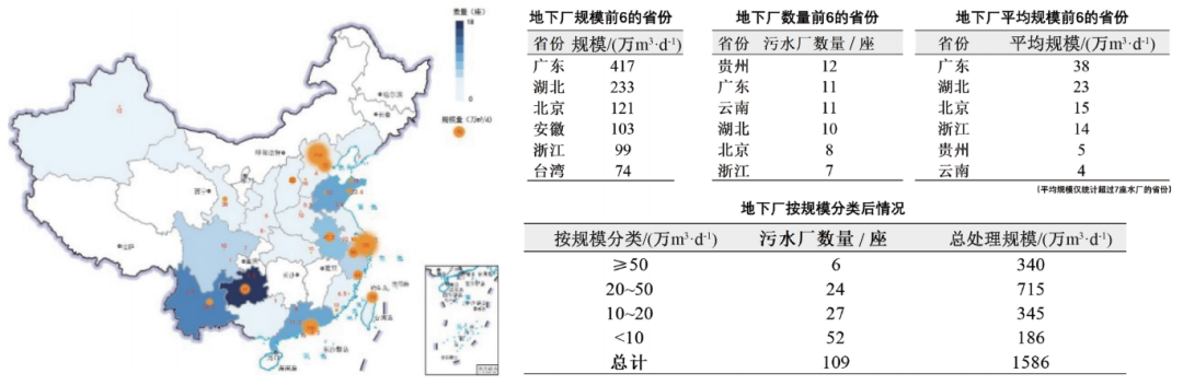 客观上,我国地下污水处理厂建设呈现逐年增长的趋势,发展十分迅速。据不完全统计,截至2020年底,我国地下污水处理厂数量达到109座,总处理规模1 586万m?/d,其中半数地下厂规模超过10万m?/d,近半数污水由20万~50万m?/d区间规模的大型地下厂处理,为全世界地下厂数量最多的国家。具体来说,我国地下污水处理厂分布具有明显的地区集中性特点,主要分布于环渤海、长三角和珠三角等经济发达地区,以及地貌较复杂的云贵川区域。如图3所示,以污水处理规模计,地下厂规模最大的省份分别为广东、湖北和北京,日处理规模均超过百万立方米,其中广东省规模居首,达到417万m?/d。以数量计,拥有最多地下厂数量的省份分别为贵州、广东和云南,均达到10座以上。不同地域的地下污水处理厂,其污水处理规模具有显著差异,云、贵两省的地下厂规模相对较小,平均规模4万~5万m?/d;而北京、浙江的地下厂平均规模相对较大,达到14万~15万m?/d;而广东、湖北地下厂平均规模较大,分别为23万m?/d、38万m?/d。地下污水处理厂已经成为“十四五”期间市政污水处理行业的新增长点。