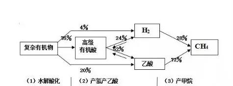理论研究认为三个阶段,即厌氧消化过程分为水解发酵阶段、产乙酸产氢阶段、产甲烷阶段三部分。