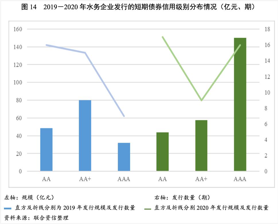 从短期融资券发行规模来看,2020年,aa+级水务企业所发短期融资券规模占比下降至24.12%,aa级水务企业所发短期融资券规模占比下降至18.23%,短期融资券发行规模呈现向aaa级集中的趋势。