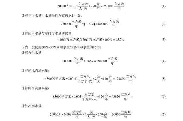 3)西安思源学院不断践行低碳节能环保,坚持创新,并且在污水处理再生水回用取得很好的成效[13][14][15]。西安思源学院董事会在2000年学校从市区迁往白鹿塬时就站在保护环境、走可持续发展道路的高度,利用有限的自有资金,建设生活污水处理站。铺设专用2m2范围内的雨水,以及一座1800立方米的游泳池、3座600立方米的景观喷水池定期换掉的剩水收集管网300多米,大小再生水水库(包括3座景观喷水池)5座,拥有各种型号水泵12台,再生水专用管线25千米。投资一千三百万完成日处理量为(2000+2000)立方米的mbr膜生物反应器的土建基础设施,安装了2000立方米/天的处理设备并于2011年9月顺利投入运行。学校于2019年11月再次投资580万元对污水处理厂原先预留的2000立方米膜处理设施进行设备安装并投入使用。9年半里mbr膜生物反应器已经处理670万立方米的污水,产出440万立方米符合国家标准再生水并全部回用。西安思源学院现有2万名师生。用再生水冲厕,浇灌48hm2绿化地,和浇酒18.3hm2路面。除了西安思源学院在污水处理再生水回用取得超出国内外许多专家、学者、制造商的预料外,还对所有资金使用、操作程序、运转数据都有案可查。可以通过以下的计算,对单位里的污水量、再生水量、再生水回用量做个概算。
