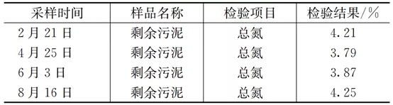 微生物在生长繁殖过程中,会摄取污水中一部分氮来合成自身细胞组分,采用《城镇污水处理厂污泥检验方法》(cj/t 221-2005)第49章中的方法对剩余污泥中氮含量进行检测,检测时间为2020年,检测结果见表1。