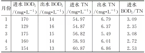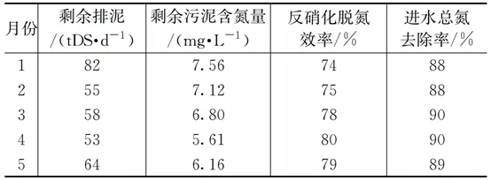 然而在实际运行过程中,受回流液中do浓度的影响,反硝化效率很难达到理论值。如表2所示,再生水厂2021年1月至5月进水bod5/tn的平均值为2.75,低于2.86的理论值。日常该水厂生物池内回流比为350%左右,按照式(2)计算理想状态下的脱氮效率为78%,在未投加外加碳源的情况下生物系统实际反硝化脱氮效率为77%(见表3)。考虑剩余污泥排放中携带的氮含量,进水总氮平均去除率为89%。