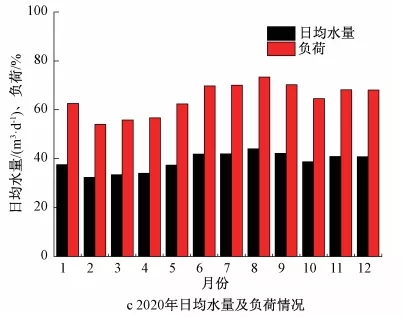 受城市生产活动的影响,污水处理厂在实际运行过程中不同时段、季节来水水量呈规律性波动。水力负荷过低或水量时变化系数过大对回流液do浓度、内回流比等脱氮重点指标控制会带来一定困难。以再生水厂2020年来水情况为例,水量峰谷差值比例超过50%(见图3a),瞬时最低负荷仅为设计值的30%。不同月份水量差异也较为明显,最低负荷仅为设计值的53%(见图3c)。