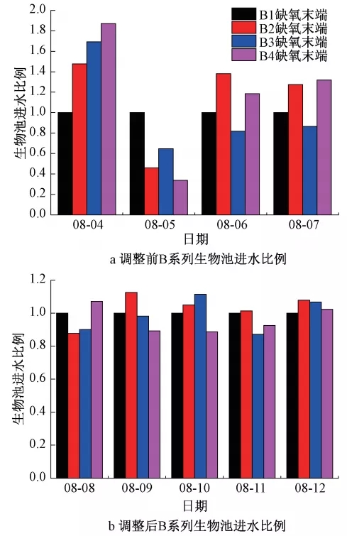 如图5所示,开展配水优化工作后,各生物池间进水均匀度明显提升,同一系列各生物池间进水比例差值由33%降低至15%左右。