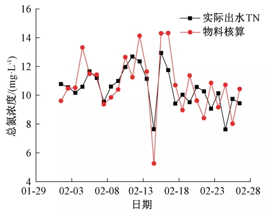 以再生水厂2020年2月份的实际出水tn与物料平衡方程模拟出水tn进行对比,结果如图7所示。