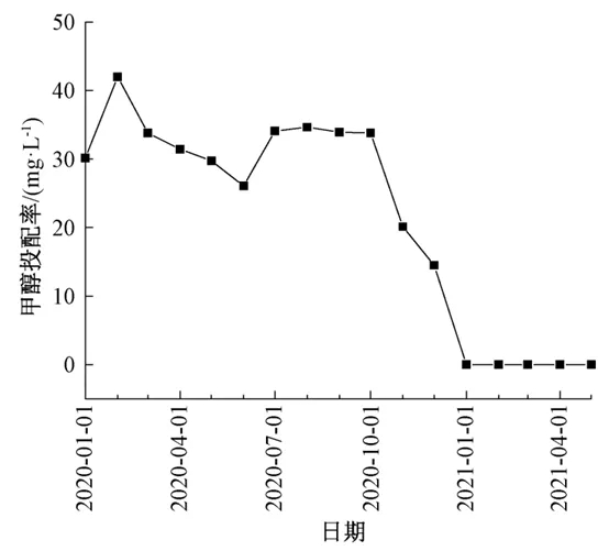 (4) 通过建立氮的物料平衡模型,对工艺运行参数进行过程控制,再生水厂甲醇投配率逐渐降低,于2021年实现了碳源零投加。