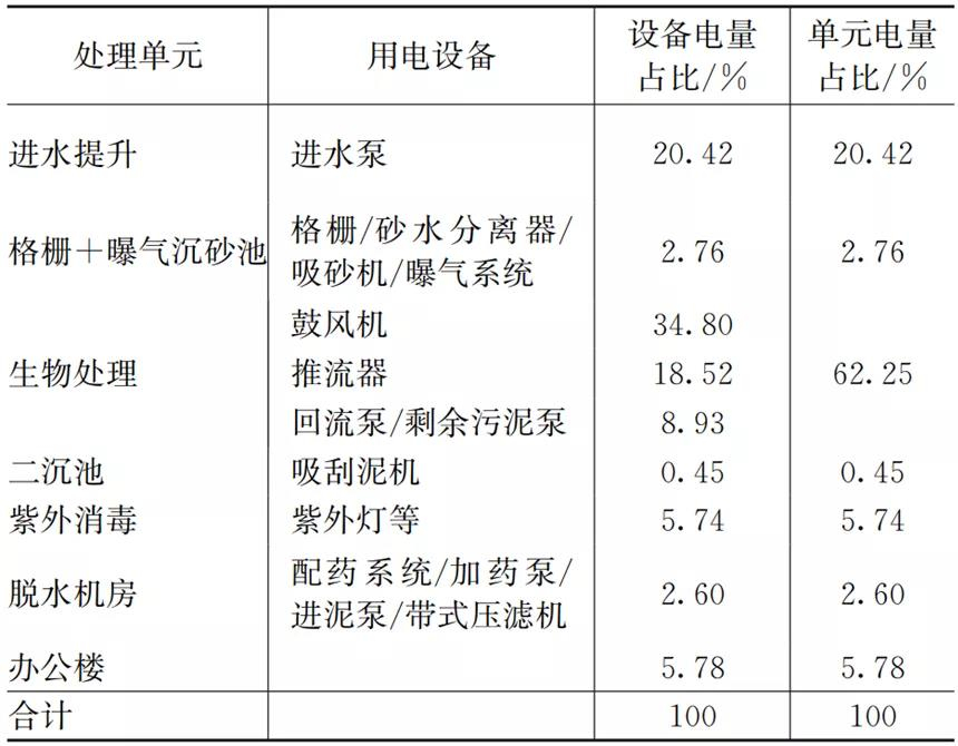 某座典型城市二级污水处理厂的电耗分布如表1所示。