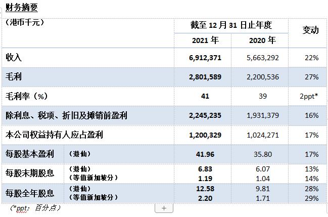 二零二一财政年度,本集团经营势头稳健,录得收入69.1亿港元,较二零二零财政年度增长22%;除利息、税项、折旧及摊销前盈利22.5亿港元,较二零二零财政年度增长16%;本公司权益持有人应占盈利12.0亿港元,较二零二零财政年度增长17%;每股基本盈利41.96港仙,较二零二零财政年度增加6.16港仙,增幅17%;整体毛利率为41%,较二零二零财政年度上升2个百分点。本集团融资渠道多元畅通,融资工具长短期兼备,资产质优,资金充裕,负债合理,财务状况健康。