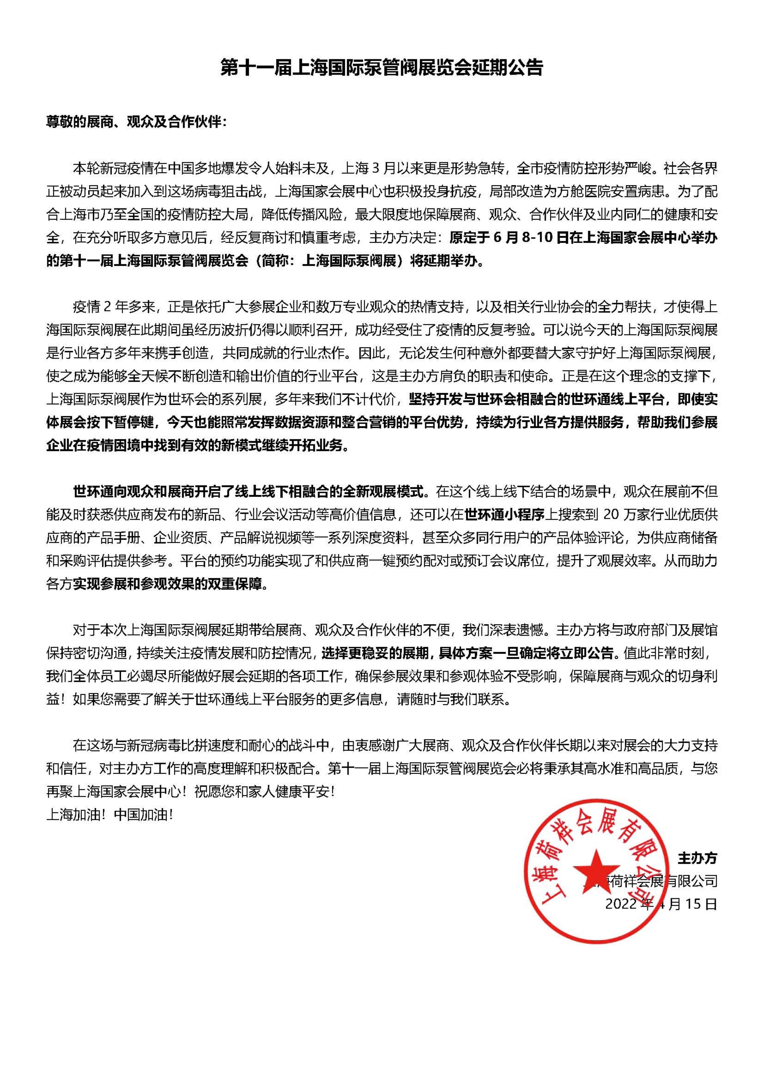 本轮新冠疫情在中国多地爆发令人始料未及,上海3月以来更是形势急转,全市疫情防控形势严峻。社会各界正被动员起来加入到这场病毒狙击战,上海国家会展中心也积极投身抗疫,局部改造为方舱医院安置病患。为了配合上海市乃至全国的疫情防控大局,降低传播风险,最大限度地保障展商、观众、合作伙伴及业内同仁的健康和安全,在充分听取多方意见后,经反复商讨和慎重考虑,主办方决定:原定于6月8-10日在上海国家会展中心举办的第十一届上海国际泵管阀展览会(简称:上海国际泵阀展)将延期举办。